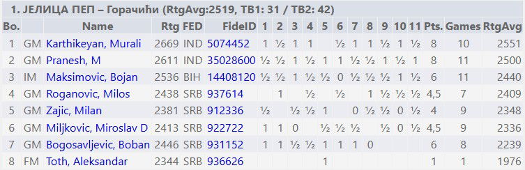 Two of the top-rated players of ŠK Jelica Pep - Goračići, GM Karthikeyan Murali (2669) and GM Pranesh M (2611) lived up to the expectations. They scored an unbeaten 8/10 and 8/11 each, becoming the top scorers of the team.